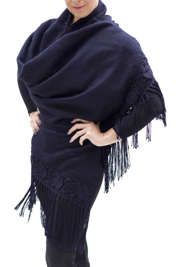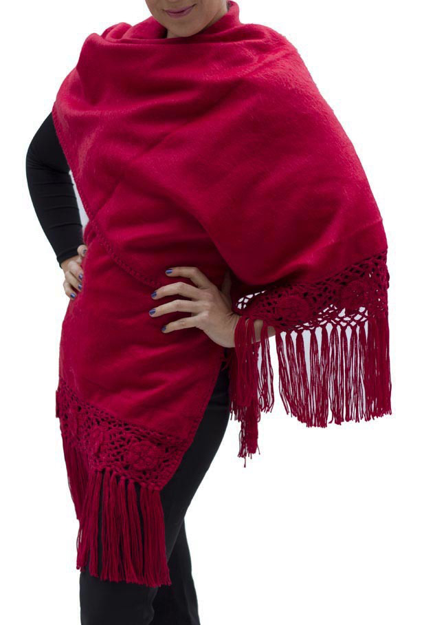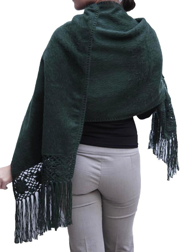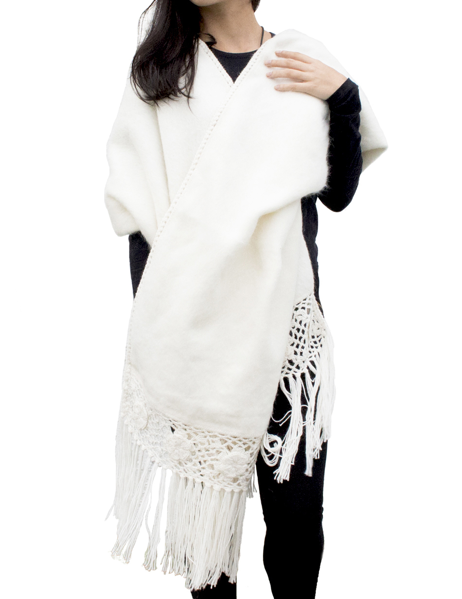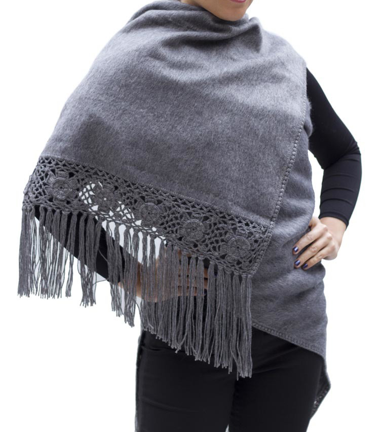 Wrap yourself in the elegant warmth of an alpaca shawl ! This luxurious alpaca shawl was handmade by expert artisans in Peru exclusively for Alpaca Warehouse. It is very soft, warm and super stylish. It has a gorgeous crocheted fringe with a rose design, an exquisite detail. Spoil yourself with an elegant accesory that has the same velvety texture on each side and will keep you warm and fashionable as long as you wear it.