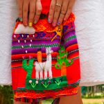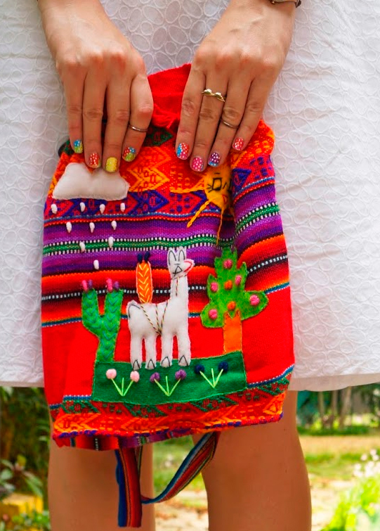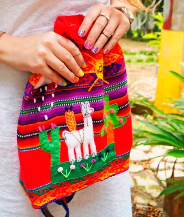 This Arpiillera Backpack is very handy for young children. It is woven, featuring hand-embroidered Arpillera-patchwork! Bright, bold colors, with a pull-tie closure.