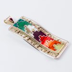 Silver pendant 950 with inlaid chrysocolla, spondylus, abalone, mother-of-pearl and spondylus. Its design is inspired by the sacred mantles worn by priests in sacred rites.