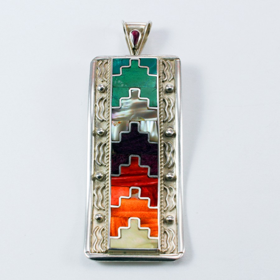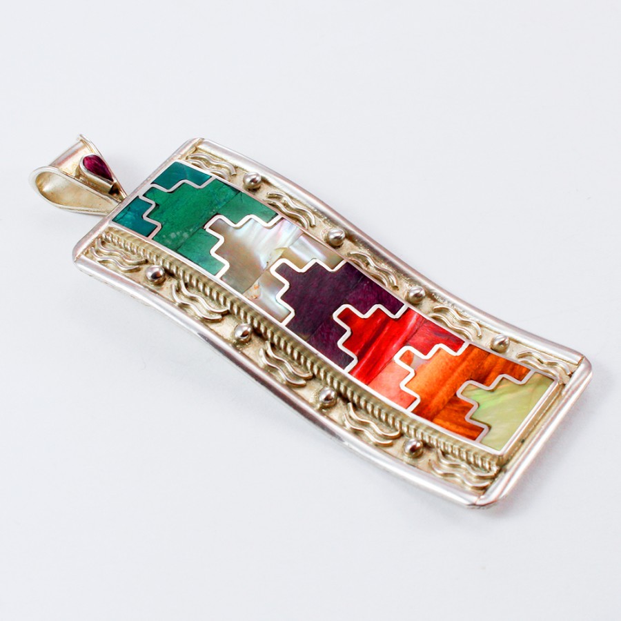 Silver pendant 950 with inlaid chrysocolla, spondylus, abalone, mother-of-pearl and spondylus. Its design is inspired by the sacred mantles worn by priests in sacred rites.