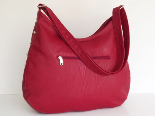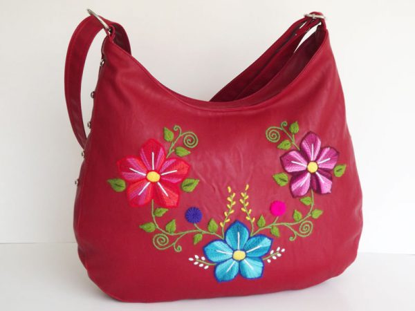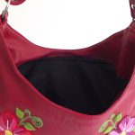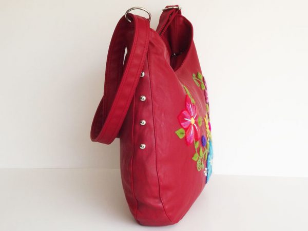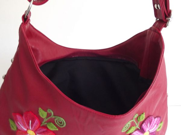 Shoulder bag with hand embroidered on red leatherette flowers. red inner lining. internal zip pocket 13cm.