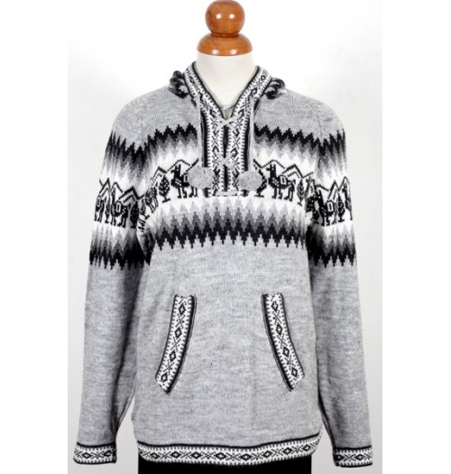 This is a new alpaca hooded sweater, handmade in Peru. It is very soft, comfortable and warm. It has a beautiful design with small flames in matching curtains around the sweater. Its main color is gray, easy to match with any outfit.