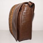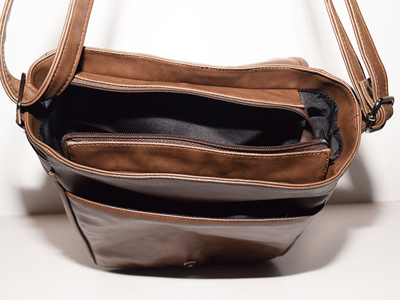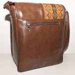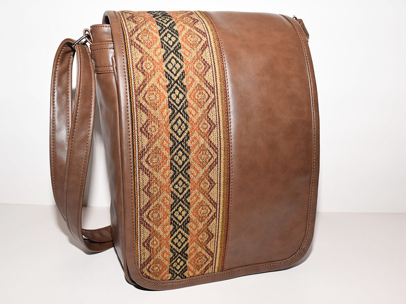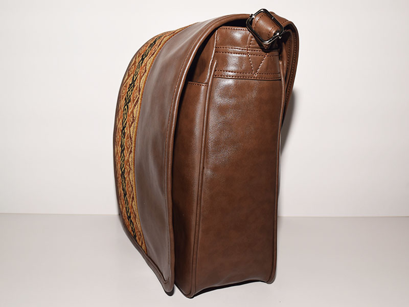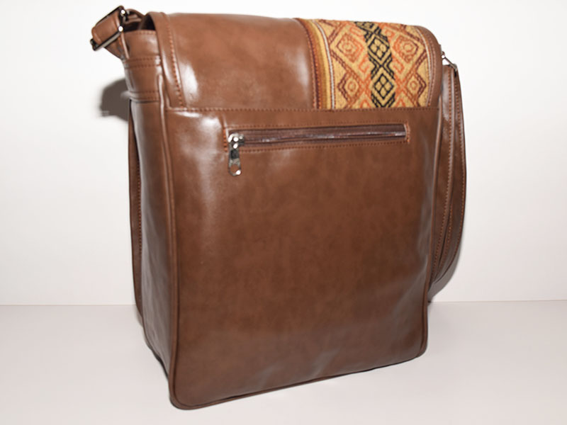 Application blanket over brown leatherette. Zippered mouth. Cover withmagnetic clasp. Inside is black fabric lining, padded interior. 24cm front pocketand back pocket of 16 cm.