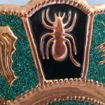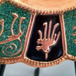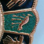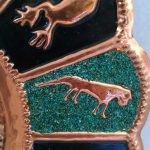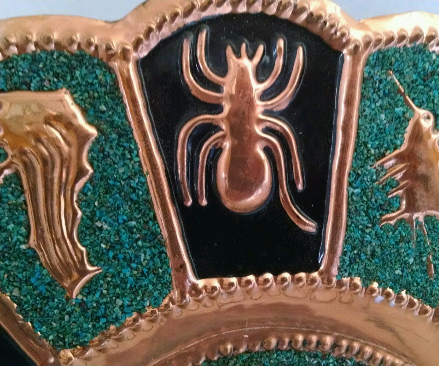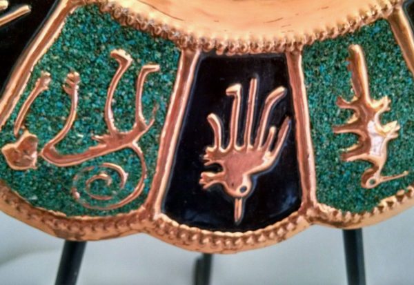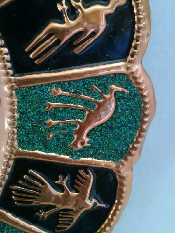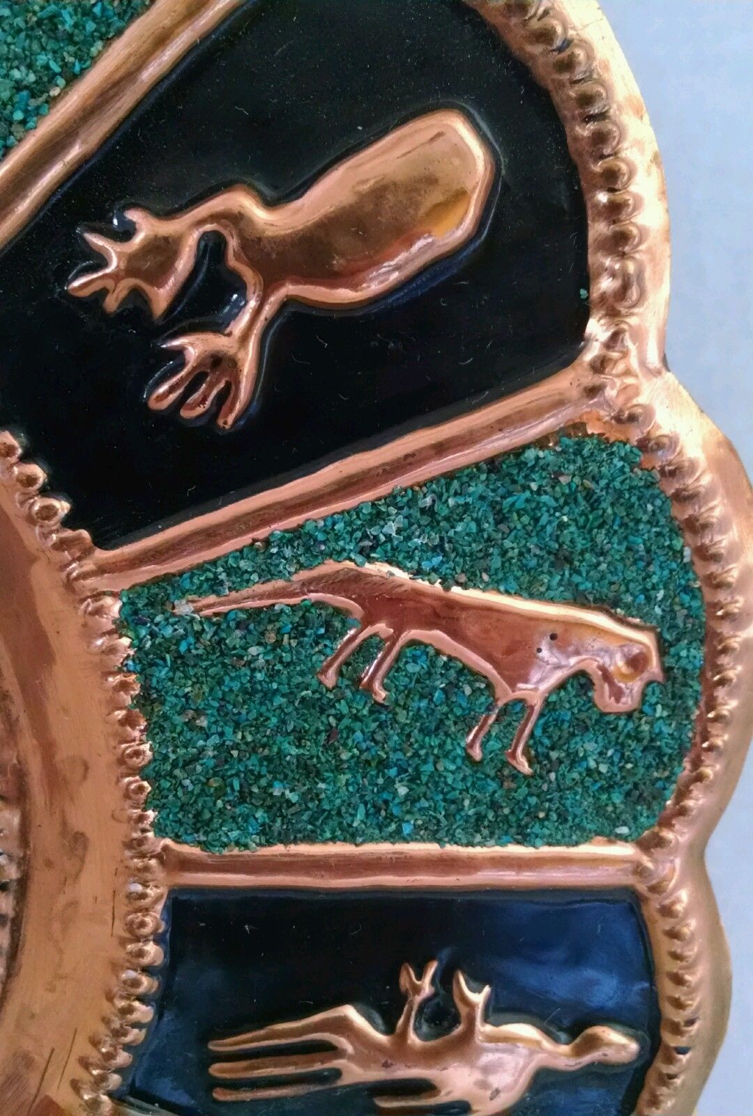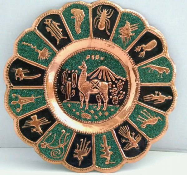 WALL PLATE FROM PERU, COPPER WITH TURQUOISE STONES. Wall plate from Peru, copper with turquoise stones. Typical wall plate from Peru. It shows the vulcano “Misti” by Arequipa and the national animal Alpaca.