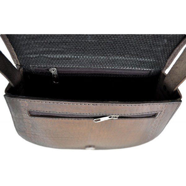 This petite but sturdy boxy-constructed shoulder strap bag is made of genuine cow’s leather with unique handwoven sheep wool aguayo cloth inset. Aguayo is a typical fabric of the Andes characterized by its durability and colorfulness. The bag has two small zip pockets, an adjustable strap and a magnetic clasp closure. Leather is embossed with decorative designs. Your choice of styles. Made in Perú.