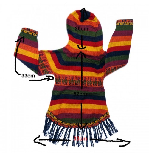 This sweater hooded poncho style with Andean colors will warm your child. Equipped with a hood and 2 outside pockets, this sweater will leave your child their movements while hot.
