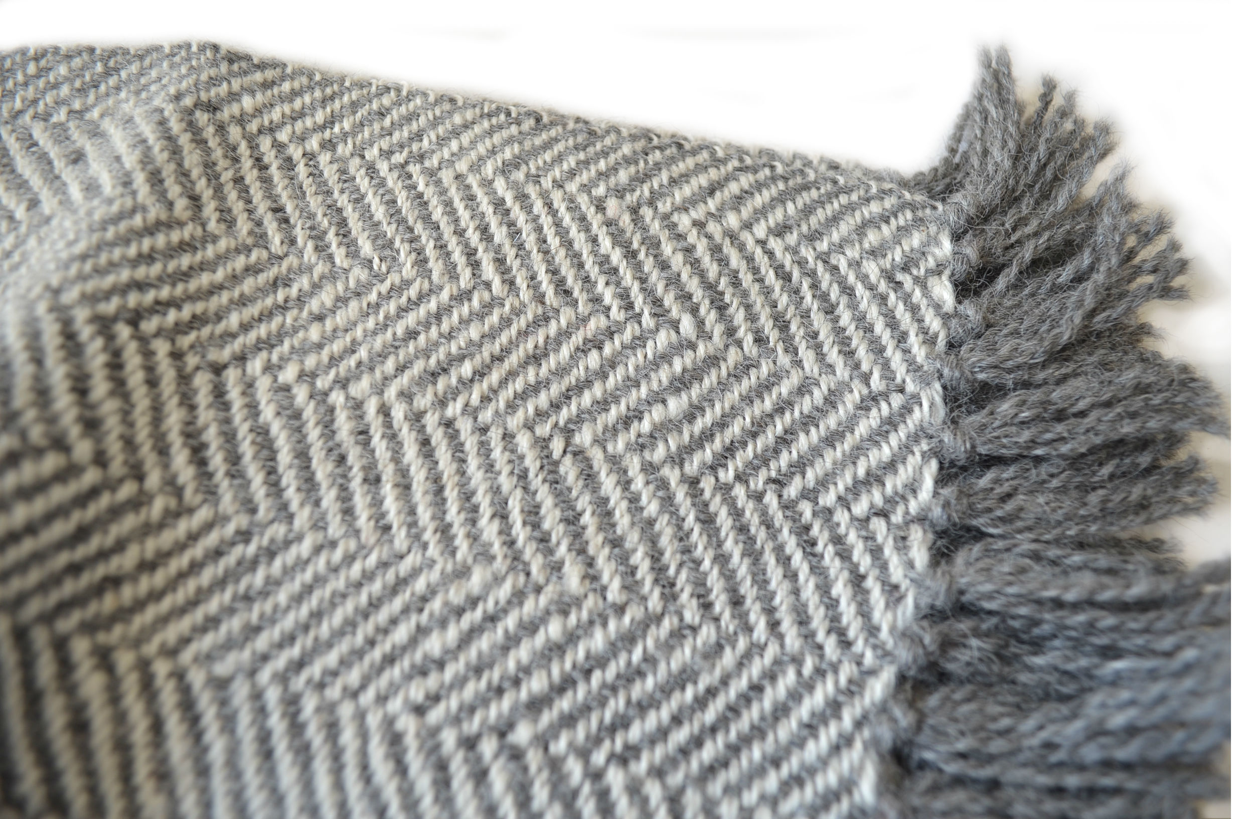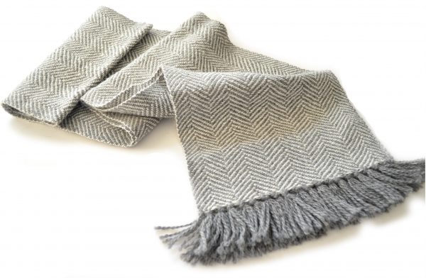 Classic design for this alpaca scarf 100% natural loom woven with thin frame design with pins or cordillate combining gray with white.