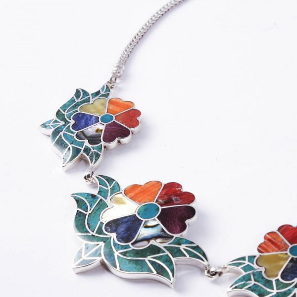 Necklace made in silver inlaid chrysocolla, sodalite, spondylus, nacre. Piece made by hand.