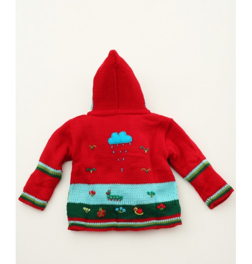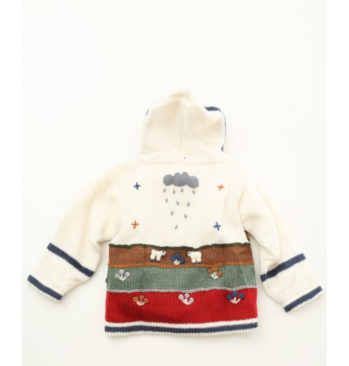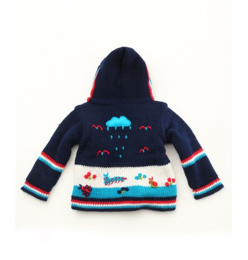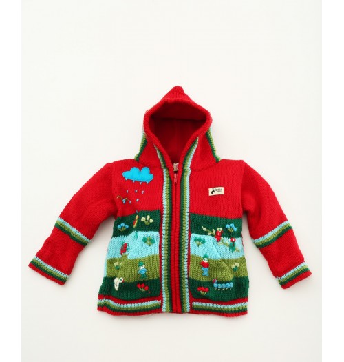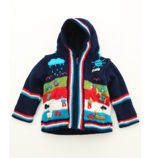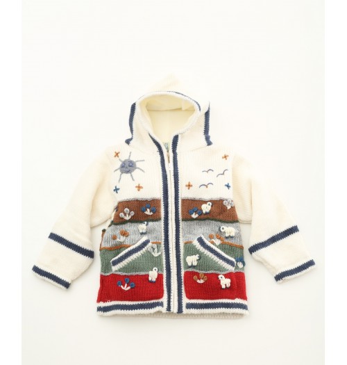 Adorable children’s applique cardigan of Alpaca. This charming cardigan is lovingly handmade in Peru with the finest attention to detail. With embroidered animals, flowers and more, your child will love talking about the different characters! The alpaca and inner fleece lining will keep little growing bodies warm in the sweetest of ways. Features zip fastening for ease and a hood for extra warmth. As each of these cardigans are especially unique, the embroidered detailing will vary from one to another making each one even more special.