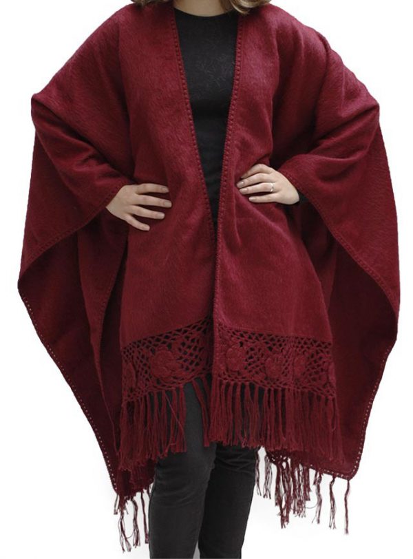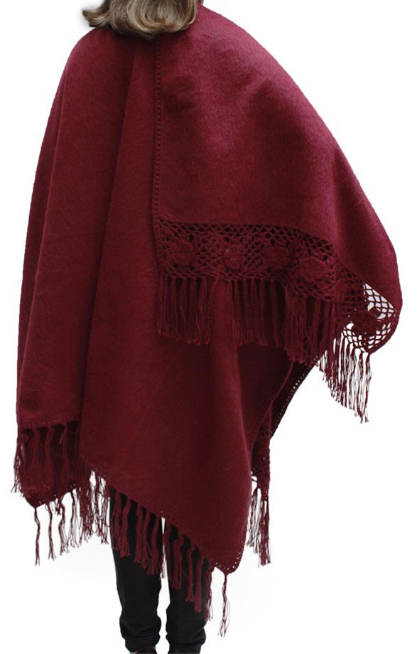 Wrap yourself in the elegant warmth of an alpaca shawl ! This luxurious alpaca shawl was handmade by expert artisans in Peru. It is very soft, warm and super stylish. It has a gorgeous crocheted fringe with a rose design, an exquisite detail. Has the same velvety texture on each side and will keep you warm and fashionable as long as you wear it.