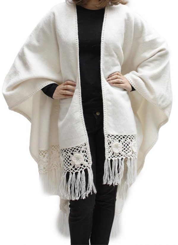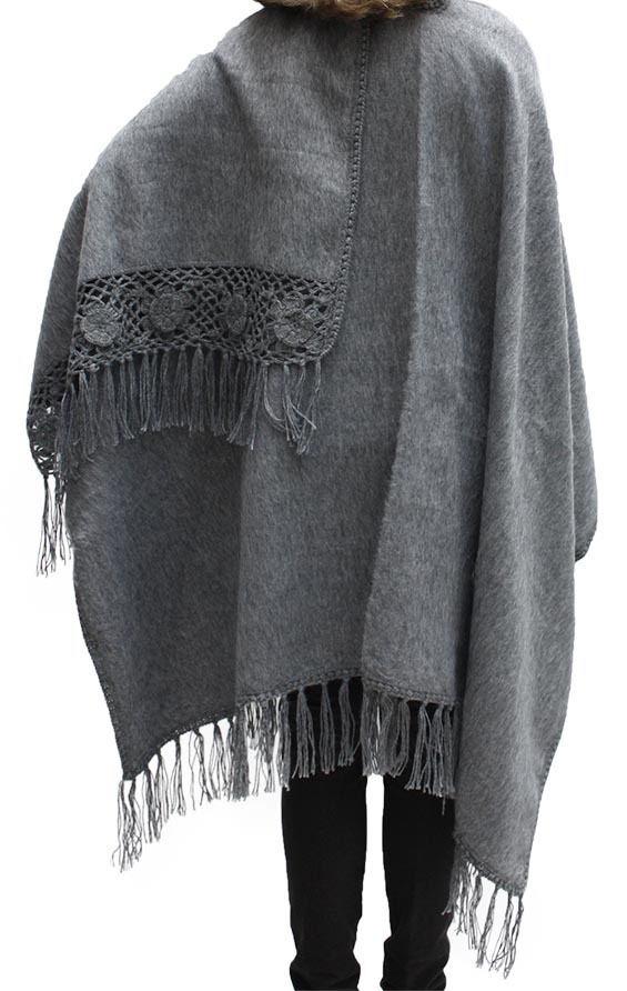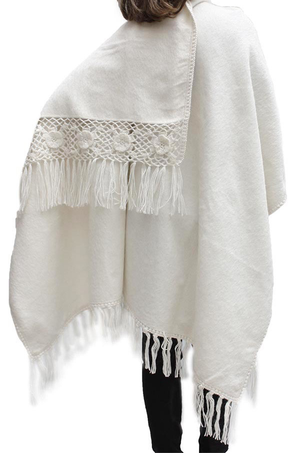 Wrap yourself in the elegant warmth of an alpaca shawl ! This luxurious alpaca shawl was handmade by expert artisans in Peru. It is very soft, warm and super stylish. It has a gorgeous crocheted fringe with a rose design, an exquisite detail. Has the same velvety texture on each side and will keep you warm and fashionable as long as you wear it.