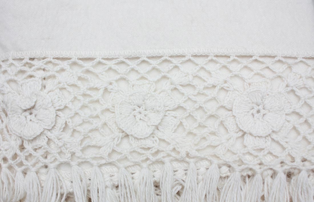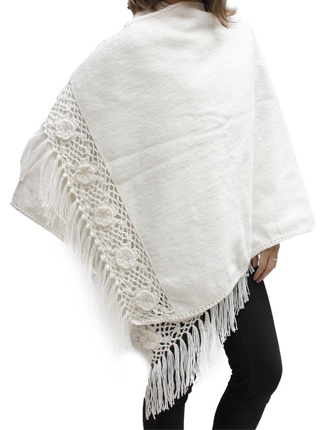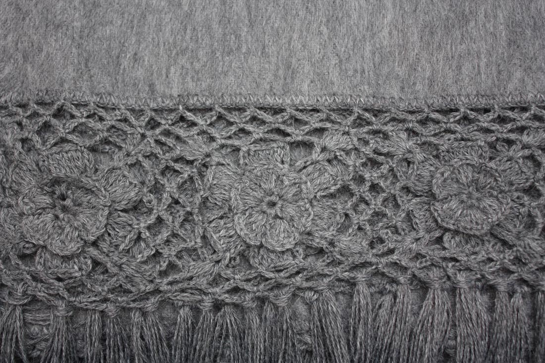 Wrap yourself in the elegant warmth of an alpaca shawl ! This luxurious alpaca shawl was handmade by expert artisans in Peru. It is very soft, warm and super stylish. It has a gorgeous crocheted fringe with a rose design, an exquisite detail. Has the same velvety texture on each side and will keep you warm and fashionable as long as you wear it.