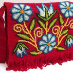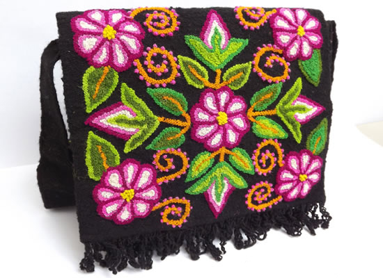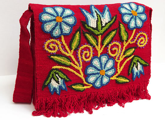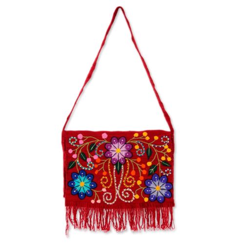 Red wool bag embroidered with flowers. Handcrafted by women in Ayacucho, central Peru.